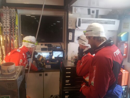 Stor interesse….liten skjerm. Gutta motiverer seg med damerenn.