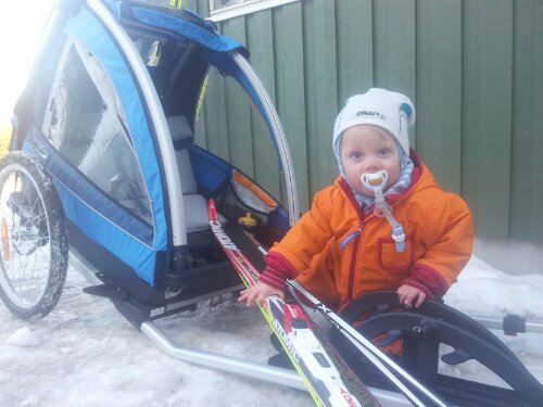 Idag trakk jeg minstemann fra der vi bor til løypa med vår Nordic Cab. Der satt han som en konge – god og varm og med flott utsikt. Da vi ankom løypa byttet jeg ut hjul med ski. Skiene jeg selv brukte var smørefrie Atomic Skintech. Det ble en super tur med godt feste, god gli, strålende vær – og det uten bruk av bil eller smørning – og best av alt minstemann koste seg.