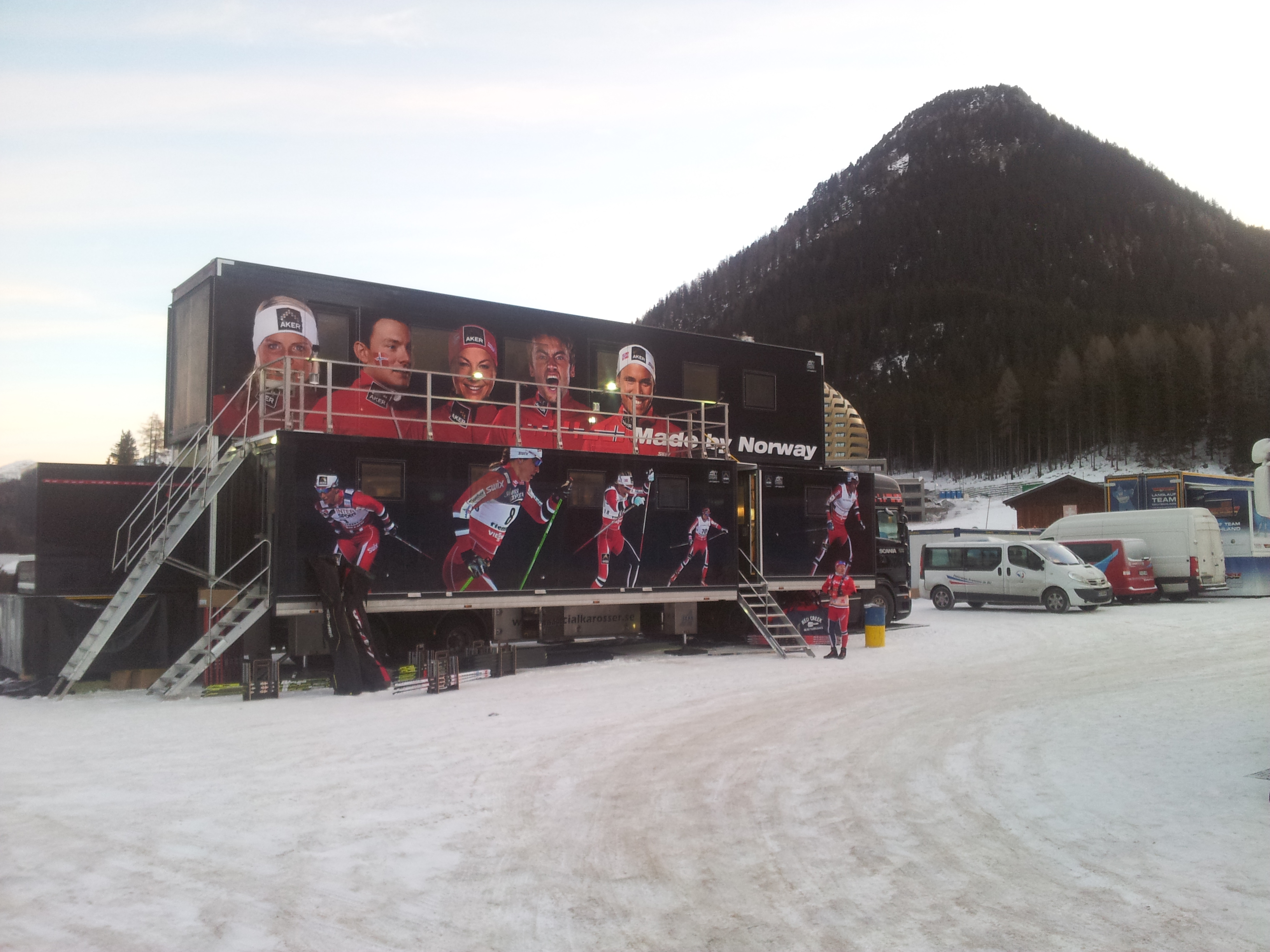 I Davos hadde endelig det russiske laget fått med seg smørebussen. Den var ferdig en stund siden, men det tok sin tid å få den registrert i Moskva. Farkosten var flott – kult design! Lett å se hvem som kommer rullende langs veien.