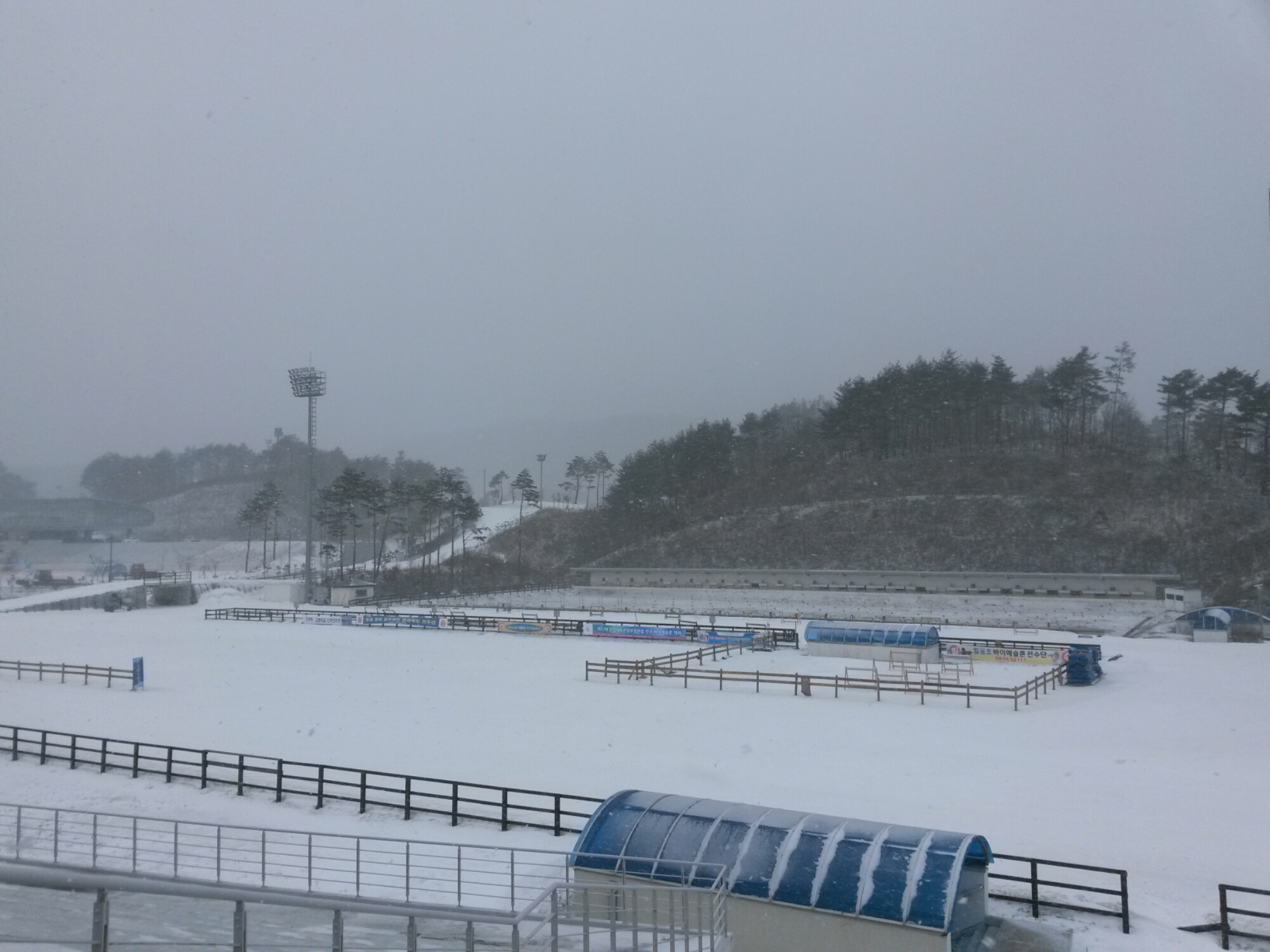 Første inntrykk av Sør Korea var rent, pent og haugevis med skyskrapere. Med 10 ganger flere innbyggere enn Norge på 1/3 av arealet så var ikke det et overraskelse. Etter noen timer i bil retning øst havnet vi i OL-byen. Hva skal man si – vi var plutselig på landsbygda. Her er det golbaner i fleng og alpinbakker – ja og selvsagt en hoppbakke, en skiskytterstadion og en langrennsstadion. De har nok en liten jobb å gjøre før det blir helt OL-vennlig her borte. Det var absolutt 0 snø før vi så et par tarmer av snø i alpinløypene. Vi var mildt sagt bekymret for skiløypene – men ble positivt overrasket over en hvit slage (hvit og hvit) som slynget seg rundt om en golfbane.